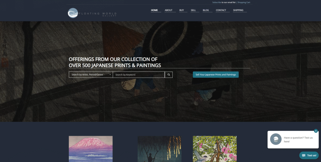 An art gallery e-commerce site specializing in Japanese prints and paintings. I implemented searchable artist / period filters, gallery view pages, and buying / selling flows for works.